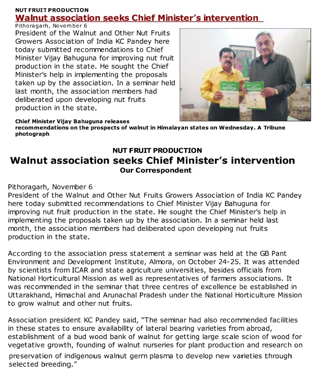 Chief Minister, Shri Vijay Bahuguna supports promotion of walnut and other nuts in Himalayan States.